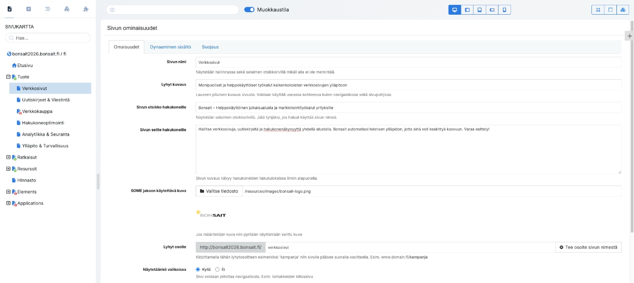 Bonsaitin avulla hakukoneoptimointi ei ole erillinen projekti, vaan kiinteä osa päivittäistä sisällöntuotantoasi. Käyttäjäystävälliset työkalut ohjaavat sinua luomaan sisältöä, joka palvelee sekä lukijaa että hakukoneita. Voit luottaa siihen, että vaikka teknologiat ja algoritmit muuttuvat, Bonsait kehittyy niiden mukana ja pitää sivustosi standardien mukaisena vuodesta toiseen.