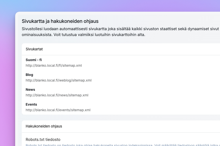 Järjestelmä ylläpitää ja jakaa sivukartan hakukoneille puolestasi, jotta uudet sisällöt löytyvät viipymättä.