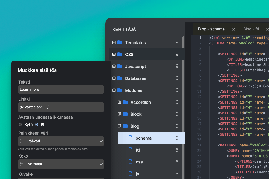 Mahdollisuus muokata jo olemassa olevia työkaluja tai toteuttaa täysin uniikkeja osioita ja toiminnallisuuksia.