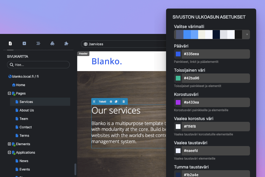 Unohda tyylien ja fonttien säätäminen. Tehokas julkaisujärjestelmä muotoilee tekstisi, kuvasi ja painikkeesi automaattisesti sivustollesi määritellyn graafisen ohjeistuksen mukaisiksi.
